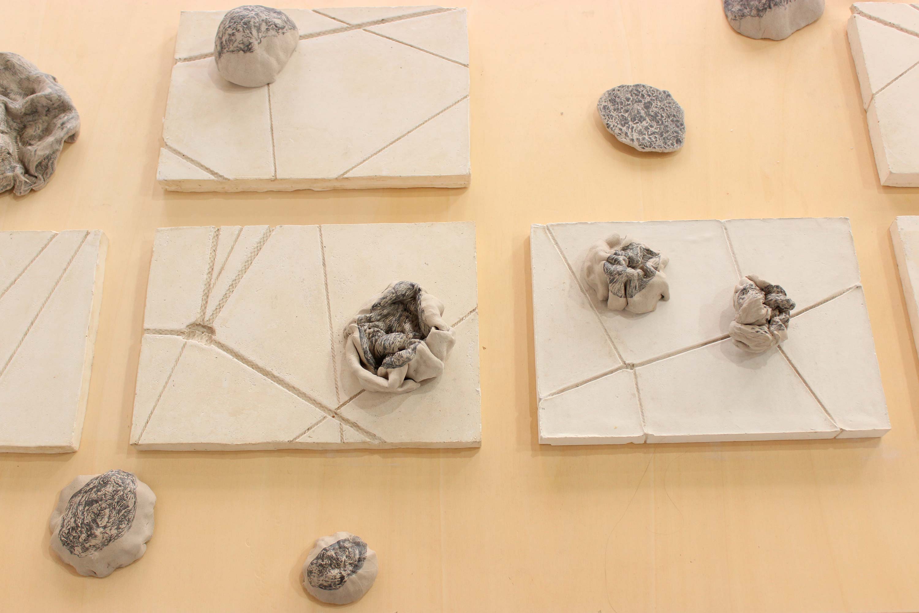 dessins à la mine graphite sur argile crue, moules en plâtre, table d'atelier